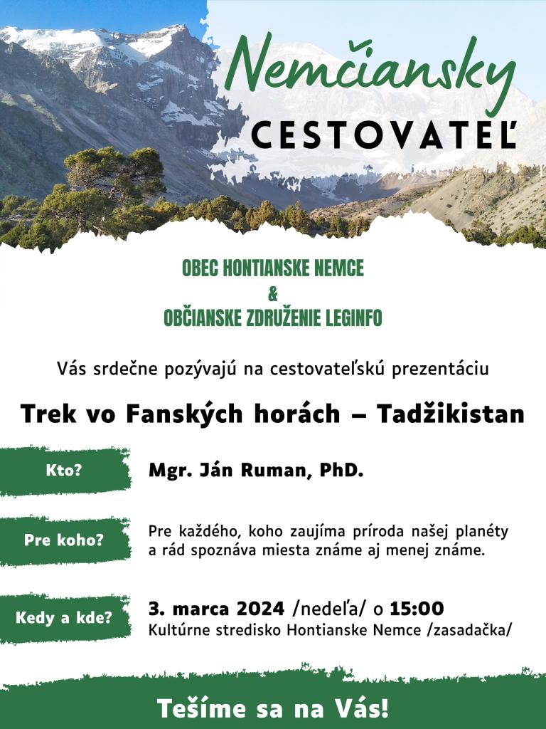 V KS Hontianske Nemce sa 3.3.2024 konala cestovateľská prednáška o Tadžikistane s Mgr. Jánom Rumanom PhD. Účastníci mali možnosť spoznať miesta prekrásnych Fanských vrchoch. Mgr. Ján Ruman je vysokoškolský učiteľ pôsobiaci na Katedre politológie FF UPJŠ v Košiciach. Okrem výučby sa vedecko-výskumne zaoberá politickou filozofiou, politickým extrémizmom a procesmi globalizácie. Vo voľnom čase je vášnivým turistom a trekárom. Turistické skúsenosti naberal v slovenských, poľských a ukrajinských Karpatoch, rakúskych a talianskych Alpách, na Rodose, Islande, kirgizskom Ťan-šane či tadžických Fanských horách. Preferuje nekomerčnú turistiku po vlastnej osi. Akcia sa konala v spolupráci s Obcou Hontianske Nemce.